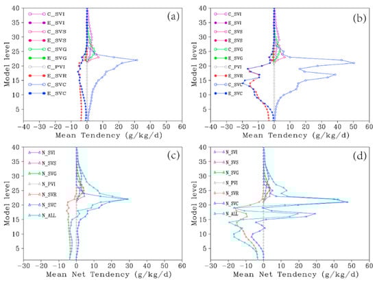 Horizontally and temporally averaged profiles of (a,b) transition rate of each WVRMPs and (c,d) their net transition rates (unit: g kg−1 d−1) over the heavy rainfall domain (108° E–120° E, 27.5° N–30° N) simulated by (a,c) the PSTA and (b,d) the SUTA from 0000 UTC on 23 June to 0000 UTC on 24 June 2017. In the legends, “C” denotes the transition rate of condensation or deposition process, “E” denotes the transition rate of the evaporation or sublimation process, “N” denotes the net transition rates for each hydrometeor, “SVI” is the deposition or sublimation of ice crystals, “SVS” is the deposition or sublimation of snows, “SVG” is the deposition or sublimation of graupels, “PVI” is the initial nucleation of ice crystals, “SVR” is the evaporation of rain droplets, and “SVC” is the condensation or evaporation of cloud droplets.