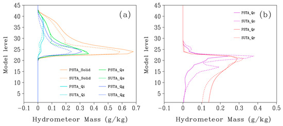 Horizontally and temporally averaged profiles of the contents of (a) the total ice-phase hydrometeors (Solid), ice crystals (Qi), snow (Qs), and graupels (Qg) (b) cloud droplets (Qc) and raindrops (Qr), (unit: g kg−1) over the heavy precipitation domain (108° E–120° E, 27.5° N–30° N) simulated by the PSTA and the SUTA from 0000 UTC on 23 June to 0000 UTC on 24 June 2017.