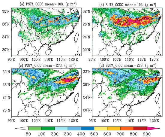 The 24-h averaged (a,b) column cloud droplets content (CCDC) and (c,d) column ice crystal content (CICC) (unit: g m−2) simulated by (a,c) the PSTA and (b,d) the SUTA from 0000 UTC on 23 June to 0000 UTC on 24 June 2017.