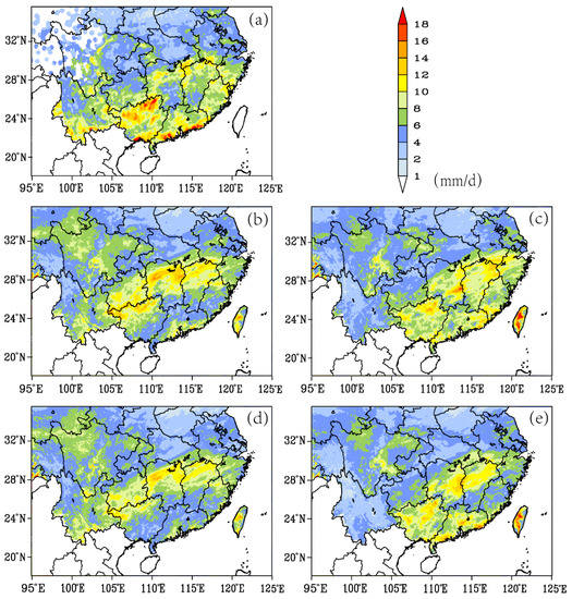 The distribution of average precipitation amount (unit: mm d −1) of (a) observations, the (b,d) 24-h and (c,e) 48-h simulation by (b,c) the PSTA experiment and (d,e) the SUTA experiment from June to August 2017.