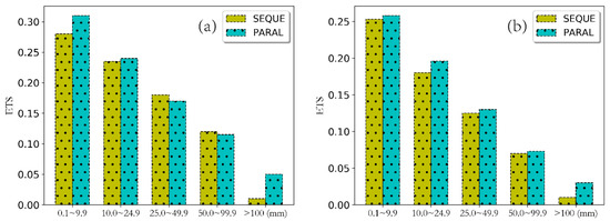The ETS is often used for the verification of precipitation forecasts since it measures the skill of a forecast relative to chance. The ETSs of precipitation simulations in different lead times for the summer of 2017 are given in Figure 10. Compared with the SUTA, the ETSs of 24-h precipitation from the PSTA simulation show a neutral and slightly positive effect as a whole. The ETSs of heavy rainfall and torrential rainfall simulated by the PSTA are lower than those simulated by the SUTA, but the ETSs of light rainfall, moderate rainfall, and rainstorm simulated by the PSTA are greater than those from the USTA simulations. In particular, the light rain and rainstorm improved significantly, with the ETSs increasing from 0.28 to 0.31 and from 0.013 to 0.048, respectively. For the 48-h simulations, the PSTA has significant advantages over the SUTA in the performance of precipitation forecasting (Figure 10b). Obviously, the ETSs for all magnitudes of precipitation simulated by the PSTA experiment are improved against the SUTA experiment, especially for moderate rainfall and rainstorm. Therefore, comprehensively, the PSTA has a better performance in precipitation forecasting compared with the SUTA, especially for the 48-h simulations. The above results reveal that reasonable treatments of the WVRMPs would effectively improve the QPFs in the development or optimization of cloud microphysics schemes.