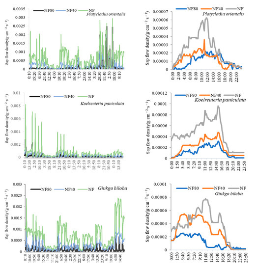 Under different ozone concentrations (NF, NF40 and NF80), the sap-flow density of Ginkgo biloba and Koelreuteria paniculata was higher than that of Pinus bungeana and Platycladus orientalis, and the sap-flow density of Koelreuteria paniculata (0.000045 g·cm−2·s−1) > Ginkgo biloba (0.000036 g·cm−2·s−1) > Pinus bungeana (0.000031 g·cm−2·s−1) > Platycladus orientalis (0.000024 g·cm−2·s−1) under NF ozone concentration; the sap-flow density of Ginkgo biloba (0.000028 g·cm−2·s−1) > Koelreuteria paniculata (0.000021 g·cm−2·s−1) > Platycladus orientalis (0.0000119 g·cm−2·s−1) > Pinus bungeana under (0.0000114 g·cm−2·s−1) NF40 ozone concentration; and the sap-flow density of Koelreuteria paniculata (0.000012 g·cm−2·s−1) > Ginkgo biloba (0.0000114 g·cm−2·s−1) > Platycladus orientalis (0.0000096 g·cm−2·s−1) > Pinus bungeana (0.0000075 g·cm−2·s−1) under NF80 ozone concentration. The increase in ozone concentration significantly reduced the sap-flow density of plants, which was more evident on Koelreuteria paniculata and Ginkgo biloba. At ozone concentrations of NF40 and NF80, compared with the ozone concentration of NF, the sap-flow density of Pinus bungeana and Platycladus orientalis decreased by 57.06% and 68.00%, respectively; while that of Koelreuteria paniculata and Ginkgo biloba decreased by 58.81% and 70.66%, respectively. It can be seen that under the ozone concentration of NF40 and NF80, the sap-flow density of Koelreuteria paniculata and Ginkgo biloba decreased by 1.04 and 1.03 times as much as that of Pinus bungeana and Platycladus orientalis, respectively.