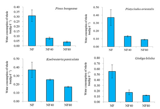 The water consumption of Ginkgo biloba and Koelreuteria paniculata was greater than that of Pinus bungeana and Platycladus orientalis under different ozone concentrations (NF, NF40 and NF80). The water consumption of Pinus bungeana was 0.19 kg·d−1–0.31 kg·d−1, Platycladus orientalis was 0.20 kg·d−1–0.37 kg·d−1, Koelreuteria paniculata and Ginkgo biloba 0.17 kg·d−1–0.37 kg·d−1 and 0.12 kg·d−1–0.55 kg·d−1. The water consumption of the whole tree under the NF ozone concentration was as follows: Ginkgo biloba (0.55 ± 0.12 kg·d−1) > Koelreuteria paniculata (0.37 ± 0.09 kg·d−1) > Platycladus orientalis (0.37 ± 0.10 kg·d−1) > Pinus bungeana (0.31 ± 0.06 kg·d−1). The water consumption of the whole tree under the concentration of NF80 ozone was as follows: Platycladus orientalis (0.20 ± 0.006 kg·d−1) > Pinus bungeana (0.19 ± 0.008 kg·d−1) > Koelreuteria paniculata (0.17 ± 0.009 kg·d−1) > Ginkgo biloba (0.12 ± 0.008 kg·d−1). The increase in ozone concentration significantly reduced the water consumption of the whole tree, which was more obvious on Koelreuteria paniculata and Ginkgo biloba. Under ozone concentration NF40 and NF80, the average water consumption of Pinus bungeana and Platycladus orientalis decreased by 30.73% and 42.33%, respectively, compared with the ozone concentration of NF, while that of Koelreuteria paniculata and Ginkgo biloba decreased by 55.96% and 66.18%, respectively. It can be seen that under the ozone concentration of NF40 and NF80, the water consumption of Koelreuteria paniculata and Ginkgo biloba decreased by 1.82 and 1.56 times as much as that of Pinus bungeana and Platycladus orientalis, respectively.