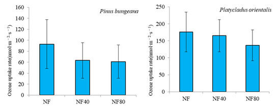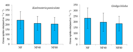 FO3 of different trees decreased with the increase in ozone concentration, Under ozone concentrations of NF40 and NF80, compared to the ozone concentration of NF, FO3 of Pinus bungeana decreased by 16.70 nmol·m−2·s−1 and 31.86 nmol·m−2·s−1; Platycladus orientalis decreased by 10.99 nmol·m−2·s−1 and 39.24 nmol·m−2·s−1, respectively; while that of Koelreuteria paniculata decreased by 39.26 nmol·m−2·s−1 and 68.05 nmol·m−2·s−1; and Ginkgo biloba decreased by 36.01 nmol·m−2·s−1 and 72.21 nmol·m−2·s−1, respectively. Koelreuteria paniculata and Ginkgo biloba decreased more than Pinus bungeana and Platycladus orientalis, indicating that Koelreuteria paniculata and Ginkgo biloba are more sensitive to ozone, have higher FO3, and thus are more seriously damaged by ozone. The reason is that the increase in ozone will first cause the closure of stomata in plant leaves, and the absorption of CO2 by plant photosynthesis will be reduced, so as to reduce the photosynthetic rate of plants. The decrease in photosynthetic rate will also reduce the water-use efficiency [10]. In this study, the water-use efficiency of Pinus bungeana and Platycladus orientalis was higher than that of Koelreuteria paniculata and Ginkgo biloba under ozone stress (Figure 4); at the same time, it is also related to the changes of tree stomatal characteristics and structure, the more stomatal opening and size of plants, the more ozone absorbed by plants. However, with ozone stress, when the external ozone concentration is larger than the tolerance range of plants, the stomatal opening of plants decreases, the transpiration of plants slows down [39] and the amount of ozone entering the stomata decreases. Therefore, FO3 decreases accordingly. The sap-flow density, water consumption and FO3 of different trees at different ozone concentrations were higher than those of Pinus bungeana and Platycladus orientalis, which indicated that the transpiration of Pinus bungeana and Platycladus orientalis was lower than that of Koelreuteria paniculata and Ginkgo biloba. The reason was that Koelreuteria paniculata and Ginkgo biloba used for larger crown and sapwood area, mostly grew faster and needed more water. The stomatal openings and stomatal sizes were larger than those of Pinus bungeana and Platycladus orientalis, but the stomatal density was smaller than that of Pinus bungeana and Platycladus orientalis. The stomatal size and stomatal openings determined the amount of ozone entering the plant [22], so the FO3 of Koelreuteria paniculata and Ginkgo biloba was higher.