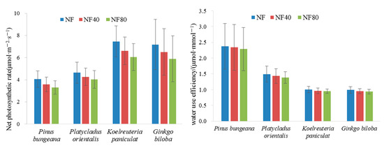 The WUE of Pinus bungeana and Platycladus orientalis is greater than that of Ginkgo biloba and Koelreuteria paniculata. Under different ozone concentrations (NF, NF 40 and NF 80), the WUE of Pinus bungeana was 2.29 μmol·mmol−1–2.37 μmol·mmol−1, the WUE of Platycladus orientalis was 1.39 μmol·mmol−1–1.49 μmol·mmol−1; the WUE of Koelreuteria paniculata and Ginkgo biloba were 0.95 μmol·mmol−1–1.00 μmol·mmol−1 and 0.93 μmol·mmol−1–0.99 μmol·mmol−1, respectively (Figure 4); The increase in ozone concentration significantly reduced the WUE of plants, which was more obvious on Koelreuteria paniculata and Ginkgo biloba. Under the ozone concentration of NF 40 and NF 80, the average decline rates of WUE of Pinus bungeana and Platycladus orientalis were 1.53% and 3.31%, respectively; compared with the ozone concentration of NF; the average rates of decline in WUE of Koelreuteria paniculata and Ginkgo biloba were 2.32% and 5.43%, respectively. It can be seen that under the ozone concentration of NF40 and NF80, the rates of decline in the WUE of Koelreuteria paniculata and Ginkgo biloba were 1.52 and 1.64 times those of Pinus bungeana and Platycladus orientalis, respectively.