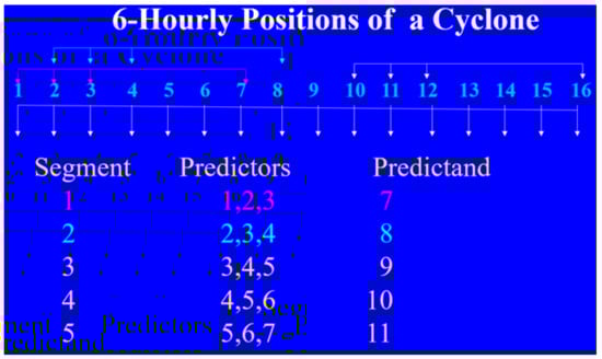 ANN requires a large number of data records (i.e., sets of conditions for a specific time) to develop the model. Since we do not have enough points if we consider the actual cyclone points rather than just landfall points, each cyclone track has been divided into different segments. A schematic representation of the procedure adopted for segmentation into a 24-h forecast with 6-h interval data is given in Figure 1. For example, for a 24-h forecast if the present position (in terms of latitude and longitude) is at point 3 in Figure 1, that position as well as the previous two six-hour positions (at 2 and 1) are considered as the predictors, and the position at 7 after 24 h from the present position is taken as the predictand. Thus, the positions for the predictors for this first segment are 1, 2, and 3, and the predictand is 7 (pink line). For example, if the present position is at 18 h, locations of 6, 12, and 18 h are the predictors (current and past positions), and the location at 18 h (the next day) is the predictand (forecast position). Then, the second segment is moved to position 2 after 6 h and, for the second segment, positions at 2, 3, and 4 are the predictors, and position at 8 is the predictand (magenta line). Similarly, for segment 12, positions at 10, 11, and 12 are the predictors, and position at 16 is the predictand.