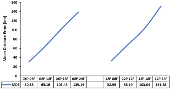 Mean Distance Error (MDE) for the different time periods with 6-h and 12-h past positions with 6-h interval data.