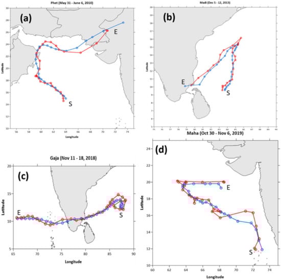 A comparison of the best track from JTWC (blue colour) and the predicted tracks from ANN (red colour) of the cyclones during (a) 31 May–6 June 2010 (Very Severe Cyclonic Storm Phet); (b) 5–12 December 2013 (Very Severe Cyclonic Storm Madi); (c) 11–18 November 2018 (Very Severe Cyclonic Storm Gaja); and (d) 30 October–6 November 2019 (Extremely Severe Cyclonic Storm Maha). (Note: S indicates the starting point, and E indicates the ending point).