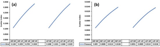 Scatter Index (SI) of (a) wind speed and (b) pressure for the different lead times of 6 and 12 h and with past 6-h interval data. Note: ‘xxP yyF’ means xx past hours and yy forecast hour.