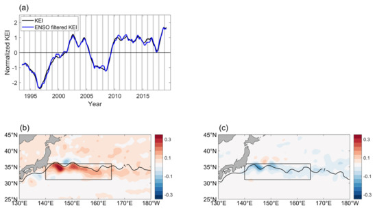 (a) Time series of the monthly normalized KEI (black line) and ENSO-filtered KEI (blue line) based on the AVISO SSHA observations. The KEI in OND is marked by grey bars. Composite SSHA (shading, unit: m) and KE axis defined by the 1 m sea surface height (black curve, unit: m) for the (b) SPs and (c) USPs from 1993 to 2018. The black rectangles in (b,c) denote the area used for calculating the KEI.