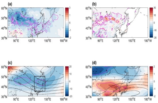 The estimated responses of (a) 2 m air temperature (shading, unit: K), (b) snow cover (shading, unit: %), (c) z500 (shading, unit: gpm), and (d) u300 (shading, unit: m s−1) in DJF onto the KEI 2 months earlier. The thin black contours and thick black rectangle in (c) represent the climatological z500 in DJF and the area used for calculating the EATII, respectively. The climatological u300 in DJF is denoted by the black contours in (d). Magenta contours represent where the atmospheric anomalies are significant at the 90% confidence level.