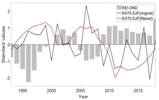 Normalized values of the KEI in OND (grey bar), EATII in DJF (black line), and lowpass EATII in DJF (red line). The lowpass EATII is calculated by applying a Savitzky–Golay filter with a window length of 11 years and a degree 2 polynomial to the EATII, to extract the EAT variation signal with the same frequency as the KE.