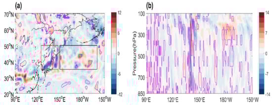 To understand how the KE-induced disturbance propagates, the anomalous RWS, WAF, and geopotential height are analyzed in Figure 5 and Figure 6. Refs. [,] suggested that the Rossby waves driven by the pronounced positive SST anomalies in the mid-latitude North Atlantic can affect the EAT through the accumulation of the wave energy. In our study, as depicted in Figure 5, a RWS emerged in the middle and upper troposphere over the central and eastern parts of KE region, which may also arise from the underlying warm SST response. Conversely, forced by the cold SST anomalies near the Japan (Figure 2a), a noteworthy Rossby wave sink extended throughout the entire troposphere over East Asia. Figure 6b further shows that the KE excited the upward propagation of the WAF from the lower troposphere of the KE to the middle and upper troposphere and then posed a Rossby wave train propagating eastward along North America, the North Atlantic, northern Eurasia, and ultimately arriving the Rossby wave sink in East Asia (Figure 6). As a result, the Rossby wave activity played a critical role in decreasing the geopotential height (Figure 6a) and strengthening the EAT, leading to a deepening rate of approximately 0.075 gpm day−1, which can explain 25% of the EAT amplification (Figure 7a).