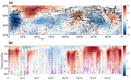 The estimated responses of (a) geopotential height (shading, unit: gpm) and horizontal WAF (vectors, unit: m2 s−2) at the 300-hPa level and (b) zonal component of WAF (shading, unit: m2 s−2) and WAF (vectors, unit: m2 s−2 for horizontal component; −10−2 Pa m s−2 for vertical component) along the 30°–80° N meridional average in DJF onto the KEI 2 months earlier. Magenta contours represent where the geopotential height and zonal component of WAF anomalies are significant at the 90% confidence level in (a,b) respectively. Only the WAF passing the 90% confidence level is plotted.