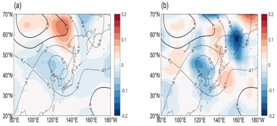 The East Asian trough (EAT), as one of the three major troughs in the winter of the Northern Hemisphere, is featured by the strongest negative deviation from the zonal mean over East Asia [,]. Its formation is mainly attributed to the large-scale thermal contrast between the cold Eurasian continent and warm Pacific Ocean [,]. As an important climate system, the EAT is crucial for the winter climate in the North Pacific and East Asia. To the east of the EAT, the EAT sustains a sharp meridional temperature gradient by bringing the cold monsoonal air to the warm ocean, which is critical for the North Pacific storm track [,,]. Over the upstream side of the EAT, the East Asian winter monsoon (EAWM), highly associated with the EAT system, dominants the winter climate of the East Asian countries. Strong EAWM related with the deep EAT often brings cold surges and blizzard to East Asia, resulting in substantial economic and social losses [,]. Therefore, it is of great importance to understand the factors and processes of the EAT, which can help us to improve the forecasts of the EAT and its representation in climate model.