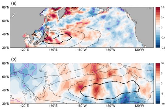 The KE, known as the strongest western boundary current in the world, shows a bimodal interannual fluctuation between a stable state, with a sharp SST front and subdued ocean mesoscale eddy activity; and an unstable state, in which the SST front is weaker and accompanied with substantial eddies []. This KE fluctuation is found to have significant impacts on not only the local atmospheric boundary layer and clouds [,,,] and North Pacific storm track, but also the large-scale circulation, among which the eddy–mean flow interaction and Rossby wave activity are suggested to play crucial roles [,,,,,]. Ma et al. demonstrates that the unstable KE state generates the mesoscale SST variability, enhancing the winter cyclogenesis via moist baroclinic instability []. The modulation in the storm track in turn leads to a barotropic anticyclone anomaly over the Eastern Pacific through the eddy–mean flow interactions, strongly influencing the blocking frequency there []. On the other hand, in the stable phase of the KE, the SST warming in the Kuroshio-Oyashio Extension region leads to an upward surface heating and a northeastward shift of the storm track, exciting the Rossby wave that propagates poleward and eastward, resulting in an equivalent barotropic large-scale signal, with a downstream weakened surface Aleutian low and a low over the Arctic [,].