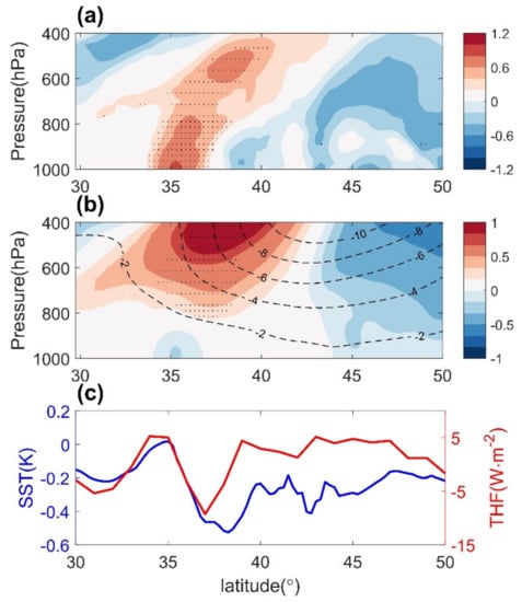 In addition to being able to impact the atmospheric circulation through the Rossby waves and transient eddies, the SST anomaly in the KE region can also modify the basic atmospheric flow via direct thermal forcing, as depicted by the thermal wind theory. The SST decrease of 0.5 K around 37° N cools the overlying atmosphere through suppressing THF by 10 W m−2 (Figure 9c), leading to the atmospheric responses titling northward as height increases, with the enhanced (weakened) meridional temperature gradient south (north) of 42° N on the 500-hPa level (Figure 9a). According to the thermal wind theory, the 500-hPa westerly winds south (north) of 42° N will be accelerated (decelerated), resulting in a significant anomalous cyclone over East Asia, which corresponds to a stronger EAT (Figure 9b). The similar physical process through which the SST anomaly in the northwestern Pacific influences the EAT is also addressed in [,], highlighting the importance of thermal wind process in SST modulating the EAT.
