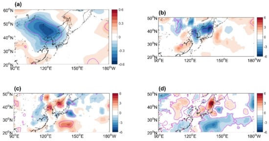 However, some problems still remain to be solved in the future. Figure 6a shows strong geopotential height responses over the U.S. Northern Atlantic coast and Mediterranean basin, implying the KE fluctuation can exert far-reaching impacts on the trough systems further downstream via the Rossby wave activity. The specific relationship and associated physical mechanisms need further investigation. In addition, as one of the most vulnerable regions to global climate change, the warming rate of the KE is two to three times faster than the global mean surface ocean warming rate [,,], promoting the question of whether the KE warming is important in our understanding of future EAT and associated EAWM system changes. All these problems need to be answered by means of diagnostic analysis and numerical simulations in the next work.