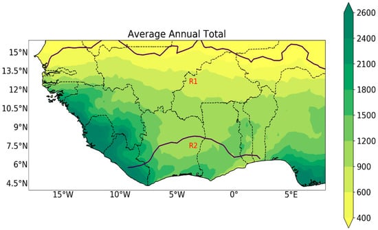 The processes for calculating onset dates are in three phases, with full subtleties laid out in []. To begin with, harmonic analysis was used to categorise the number of rainfall seasons experienced in a year. The rainfall regime at each grid point is categorised as being dominantly unimodal (one rainfall season per year) or bimodal regime (two rainfall seasons per year). This is accomplished by computing the ratio of the amplitude of the second harmonic to the first harmonic. If the ratio is greater than 0.75, the amplitude of the second harmonic is larger, and the grid point is classified as having a bimodal rainfall regime. If the ratio is less than 0.75, the grid point is classified as having a unimodal rainfall regime. This is marked in Figure 1 as a contour line. The second harmonic is relatively large generally near the equator and portrays the two wet seasons that occur following the two crossings of the solar zenith []. The harmonic analysis approach used in this study is similar to that used in [,] to analyse the number of wet seasons per year over Africa, although [] used a threshold ratio of 0.75 over monthly rather than daily precipitation data and [] used a threshold ratio of 1.0. The threshold ratio value of 0.75 is chosen due to its sensitivity to the unimodal and bimodal rainfall regimes. Choosing a lower threshold ratio (less than 0.75) means some regions observing a unimodal rainfall regime become part of R1, making it challenging to refer to all grid points under R1 as bimodal. On the other hand, a larger threshold ratio (greater than 0.75) means region R1 becomes smaller, with part of R1 merging with R2. The choice of the selected threshold ratio (here 0.75) is seen, in this instance, to better represent the two regimes with little or no overlapping over Southern West Africa.