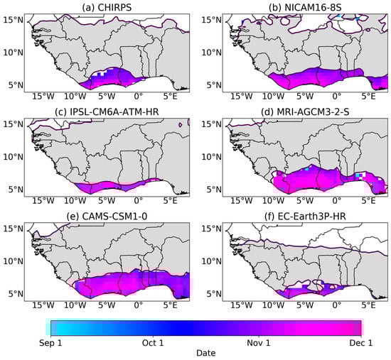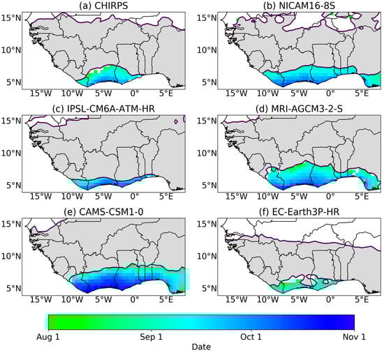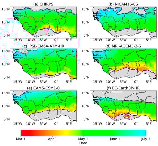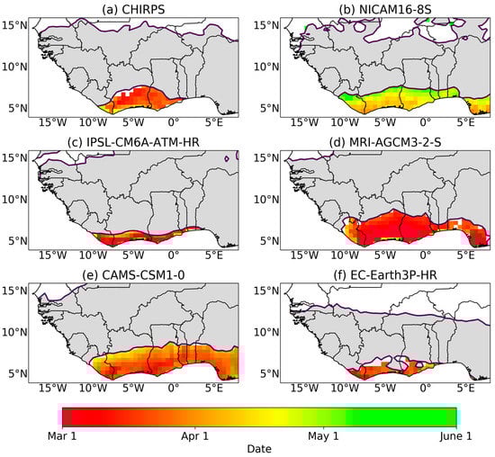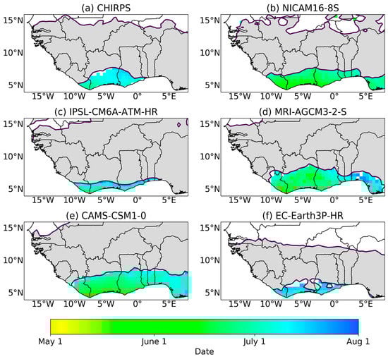 The SWA region experiences a bimodal rainfall season with two wet seasons per year. Figure 5 and Figure 6 show the mean onset and cessation for the first (major) rainfall season, respectively. It is evident from the figures that all models show onset and cessation periods for bimodal regions along SWA, indicating that the models are capturing the biannual regime, which is not always captured in model simulations []. The biannual region in these CMIP6 models, however, is found to cover a larger region (Sierra Leone through to Nigeria for NICAM16-8S, MRI-AGCM3-2-S, and CAMS-CSM1-0, and central Sierra Leone to eastern Benin for IPSL-CM6A-ATM-HR and EC-Earth3P-HR) than the smaller biannual region that is depicted by observations (from eastern Sierra Leone to Togo for CHIRPS). We find that the mean onset and cessation dates for the first (major) rainfall season are well captured by the models (late March and late July, respectively) with a late start (early May) for NICAM16-8S and a late cessation (late July) in MRI-AGCM3-2-S. Patterns observed from the CHIRPS observation dataset are similar to findings from [,].