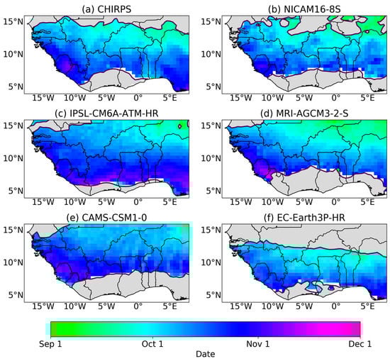 From Figure 2 and Figure 3, good agreement is observed between the observation dataset (CHIRPS) and the CMIP6 HighResMIP datasets with respect to the onset and cessation dates. Onset dates generally are observed between late March and late June over regions with unimodal rainfall patterns, marking the start of the monsoon. Onset dates agree closely with that observed by [,] using different definitions for onset. The rainfall season starts close to the southernmost coast of West Africa in early March. Figure 2 shows that onset dates for MRI-AGCM3-2-S, EC-Earth3P-HR, CAMS-CSM1-0, and IPSL-CM6A-ATM-HR agree closely with CHIRPS, while in Figure 3 all models show good agreement in representing cessation dates as observed in CHIRPS. The general meridional progression of onset and cessation dates across the region is seen as ‘late onset’ as rainfall progresses northward and ‘late cessation’ as rainfall progress south. The observed late start in onset dates as the rainfall progresses north has been associated with the delay transport of moisture into the continent due to the processes of the West African Monsoon [,,].