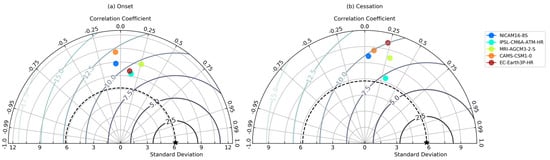 Statistical evaluation of models using Taylor diagram analysis to show the coefficient of correlation, standard deviation, and centred root mean square error for (a) onset and (b) cessation over region R1. Different coloured dots represent different datasets as described in the legend. Five-pointed star represents the observational dataset.
