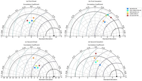 Statistical evaluation of models using Taylor diagram analysis to show the coefficient of correlation, standard deviation, and centred root mean square error of (a) first onset, (b) first cessation, (c) second onset, and (d) second cessation over region R2. Different colour dots represent different datasets as described in the legend. Five-pointed star represents the observational dataset.