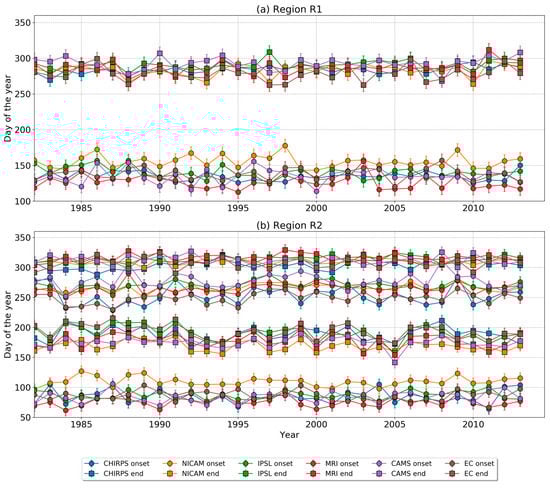 Time series of mean onset and cessation over regions (a) R1 and (b) R2. Different coloured lines indicate different data sets. The error bars show the standard deviation in onset/cessation across the region at each time.