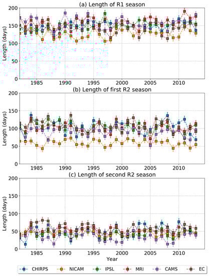 Time series of the length of the rainy season for (a) regions with annual rainfall, (b) first rainy season, and (c) second rainy season. Different coloured lines indicate different data sets. The error bars show the standard deviation in length of the rainy season across the region at each time.