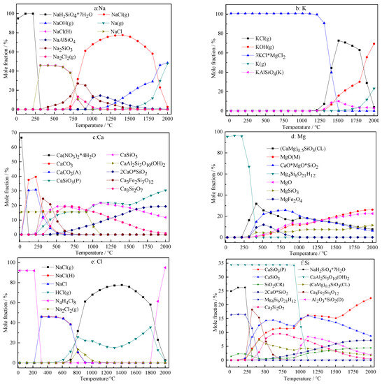Effect of incineration temperature on the migration and transformation of the major elements in ash. (a): Na, (b): K, (c): Ca, (d): Mg, (e): Cl, (f): Si. The asterisk in the chemical formula shows that the molecules or species are attached with each other as independent species, similarly hereinafter.