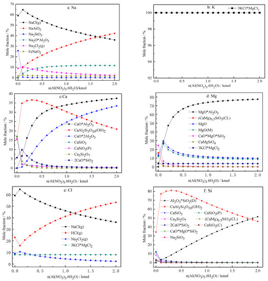 It is evident that the addition of Al(NO3)3 exerts a significant effect on the migration and transformation of the main elements in ash. As shown in Figure 2a, when the amount of Al(NO3)3 addition increases from 0 to 0.1 kmol, the content of Na2SiO3 decreases drastically. As the amount of Al(NO3)3 addition continues to increase, the content of gaseous NaCl gradually decreases, whereas the content of NaAlO2 increases rapidly. The melting point of NaAlO2 is approximately 1650 °C, which can effectively increase the ash fusion temperature [28]. It can be seen from Figure 2b that the content of 3KCl·MgCl2 changes slightly, and the addition amount of Al(NO3)3 does not affect the distribution of potassium. Figure 2c and d show that, when the amount of Al(NO3)3 addition increases, the content of CaAl2Si3O10(OH)2 first increases obviously and then decreases steadily. When the amount of Al(NO3)3 addition increases from 0 to 0.5 kmol, the contents of CaO·Al2O3, CaO·2Al2O3, and MgO·2Al2O3 with high melting point first increase rapidly, and then their contents tend to keep stable. As shown in Figure 2e, the change in the distribution of chlorine is mainly related to the transformation of part of gaseous NaCl into HCl. It can be seen from Figure 2f that, when the amount of Al(NO3)3 addition is between 0.1–0.4 kmol, the silicon mainly exists in the form of CaAl2Si3O10 (OH)2. As the amount of Al(NO3)3 addition further increases, the content of Al2O3·SiO2(D) increases continuously since CaAl2Si3O10(OH)2 is converted into Al2O3·SiO2(D). It can be inferred that the addition of Al(NO3)3 has great potential for increasing the ash fusion temperature. The results are in accordance with the previous studies, which demonstrated that aluminum-based additives could improve the fusion temperature of ash particles to suppress the formation of low-temperature eutectics.