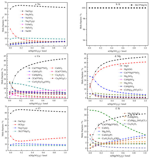 Effect of the amount of Mg(NO3)2 addition on the migration and transformation of main elements in ash. (a): Na, (b): K, (c): Ca, (d): Mg, (e): Cl, (f): Si. The asterisk in the chemical formula shows that the molecules or species are attached with each other as independent species, similarly hereinafter.