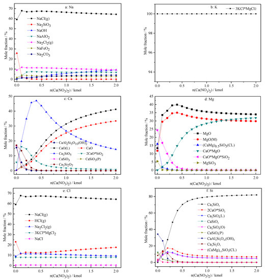 The effect of the amount of Ca(NO3)2 addition on the migration and transformation of sodium, potassium, calcium, magnesium, chloride, and silicon is drawn in Figure 4a–f, respectively. Similar to Mg(NO3)2, Ca(NO3)2 imposes an obvious effect on the migration and transformation of calcium, magnesium, and silicon. The migration and transformation of calcium can be divided into two stages. When the amount of Ca(NO3)2 addition is less than 0.5 kmol, Ca(NO3)2 mainly reacts with silicate to form Ca3SiO5. When the amount of Ca(NO3)2 addition exceeds 0.5 kmol, the content of Ca3SiO5 drops quickly, and the Ca(NO 3)2 is mainly decomposed into CaO. After the addition of Ca(NO3)2, the dominant compounds of Mg are changed to MgO and CaO·MgO. Both Ca3SiO5, CaO, MgO, and CaO·MgO are high melting point compounds, implying that the addition of Ca(NO3)2 is also able to promote the ash fusion temperature.