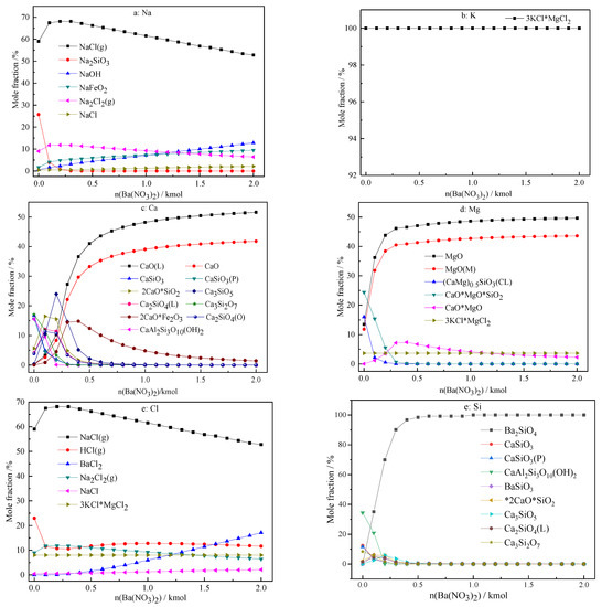 The effect of the amount of Ba(NO3)2 addition on the migration and transformation of sodium, potassium, calcium, magnesium, chloride, and silicon is given in Figure 5a–f, respectively. The effect of the addition of Ba(NO3)2 on the migration and transformation of sodium, potassium, and chlorine is similar to that of Mg(NO3)2 and Ca(NO3)2. After the addition of Ba(NO3)2, the major forms of sodium, potassium, and chlorine are still gaseous NaCl and 3KCl·MgCl2, while the forms of calcium and magnesium are altered to CaO and MgO. It can be seen from Figure 5f that silicate ions are preferentially combined with barium ions to form Ba2SiO4 after the addition of Ba(NO3)2. As the amount of Ba(NO3)2 addition increases from 0 to 0.4 kmol, the contents of Ba2SiO4, CaO, and MgO increase considerably. When the addition amount of Ba(NO3)2 exceeds 0.5 kmol, the contents of Ba2SiO4, CaO, and MgO tend to remain stable.