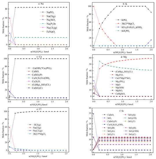 Effect of the amount of NH4HPO4 addition on the migration and transformation of main elements in ash. (a): Na, (b): K, (c): Ca, (d): Mg, (e): Cl, (f): Si. The asterisk in the chemical formula shows that the molecules or species are attached with each other as independent species, similarly hereinafter.