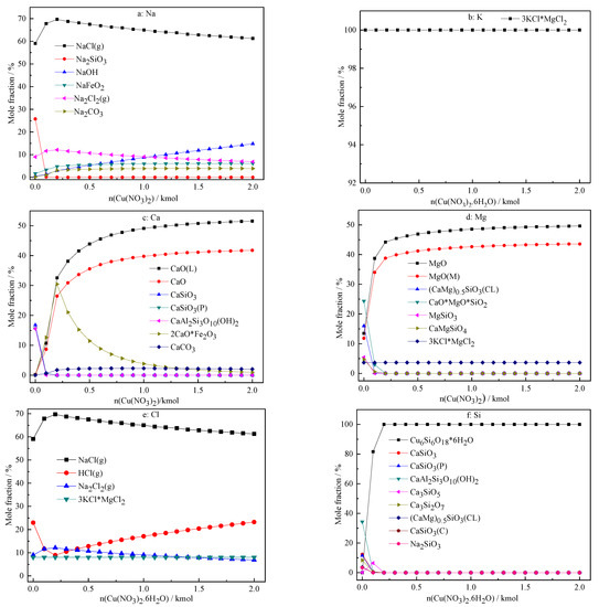 The effect of the amount of Cu(NO3)2 addition on the migration and transformation of sodium, potassium, calcium, magnesium, chloride, and silicon is depicted in Figure 7a–f, respectively. The addition of Cu(NO3)2 shows the same effect as that of Ba(NO3)2. The migration and transformation of sodium, potassium, and chlorine do not change significantly after the addition of Cu(NO3)2. The main forms of sodium, potassium, and chlorine are gaseous NaCl and 3KCl·MgCl2. The addition of Cu(NO3)2 alters the main forms of calcium and magnesium. As shown in Figure 7c,d, the addition of Cu(NO3)2 favors the formation of MgO and CaO, which could be attributed to the competitive reactions of copper, calcium, and magnesium with silicon. It is observed that Cu(NO3)2 can react with silicate ions to generate large amounts of, Cu6Si6O18 ·6H2O, which is thermodynamic preferred. The Cu6Si6O18 ·6H2O thus becomes the main phase of silicon.