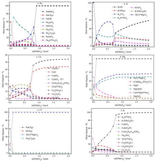 The effect of the amount of KMnO4 addition on the migration and transformation of sodium, potassium, calcium, magnesium, chloride, and silicon is shown in Figure 8a–f, respectively. The potassium in KMnO4 and the sodium in ash will compete with other elements during MSW incineration. As the amount of KMnO4 addition increases, potassium will dominate the competitive reactions. As shown in Figure 8, when the amount of KMnO4 addition is between 0 and 1.0 Kmol, KMnO4 mainly reacts with chlorine to form 3KCl·MgCl2, which becomes the major form of chlorine and magnesium. At the same time, sodium is converted from gaseous NaCl to Na2SiO3, and potassium mainly exists in the form of K2CO3 and K2SiO3. When the amount of KMnO4 addition exceeds 1.0 kmol, sodium and potassium primarily exist in the form of NaMnO4 and KOH, respectively. It is worth noting that NaMnO4 is not stable at high temperatures, and is prone to undergo decomposition reactions to generate oxygen, which is beneficial for the combustion of char during MSW incineration. The addition of KMnO4 can promote the reaction between potassium and silicate ions to form K2SiO3. However, the melting point of K2SiO3 is 976 °C [30]. Hence, the addition of KMnO4 is not conducive to improving the ash fusion temperature, but it has the potential to improve the combustion behavior of MSW as a strong oxidant.