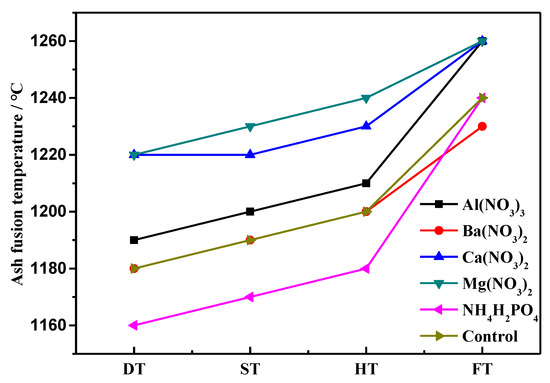 Effect of various potential additives on the ash fusion temperature, DT: the initial deformation temperature, ST: softening temperature, HT: hemispherical temperature, FT: flow temperature.