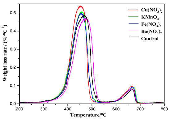 The effect of potential additives on the derivative thermogravimetric (DTG) curves for the combustion of MSW char is given in Figure 10. There are two main weight loss peaks in the DTG curves for the combustion of MSW char. The first weight loss peak appears between 300–550 °C, corresponding to the combustion of MSW char. It is found that the addition of Cu(NO3)2 and KMnO4 shifts the first peak temperature towards the lower temperature region while improving the maximum weight loss rate, indicating that these additives can serve as catalysts to accelerate the combustion reaction of MSW char. At the same time, it is observed that the addition of Ba(NO3)2 not only shifts the first peak temperature toward a higher temperature, but also reduces the maximum weight loss rate, suggesting that the addition of Ba(NO3)2 is not conducive to the combustion reaction. The second weight loss peak appears between 600–700 °C, which is mainly ascribed to the decomposition of minerals in MSW char, such as CaCO3.