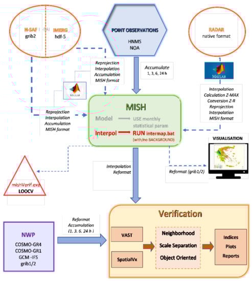 The proposed Integrated Forecast Evaluation System (IFES) aims to address the primary conditions for the application of sophisticated spatial verification methods, specifically the acquisition of gridded observations for the most realistic representation of the true state of the atmosphere, but also the targeted application of certain verification methods to better highlight the characteristics of predicted precipitation fields. The system is adapted to the needs of the Greek territory, providing sufficient information concerning the skill of high-resolution numerical models in areas with intense relief and frequently insufficient sources of in situ observations. Specifically, the methodology applied to generate statistics on a daily basis includes the components and flow shown in detail in Figure 1, and consists of the following steps: (1) gathering ground observations from all available ground based networks and format adjustment for input to MISH interpolation module; (2) aggregation of available radar data, application of filters/adaptations (e.g., radial velocity filter, Z–R conversion) and adjustment as input to MISH; (3) H-SAF data aggregation and adaptation (reprojection/interpolation in cartesian grid) and adjustment as input to MISH; (4) MISH interpolation module execution with appropriate customization of input data from the modeling module and use of surface observations with the choice of using background fields (radar and/or satellite data); (5) MISH output conversion to verification software requirements and adaptation to the resolution of the NWP model to be evaluated; (6) application of verification software, including VAST for neighborhood methods and SpatialVx for field displacement or methods; and finally (7) production of statistical indices, graphs and analysis of results.