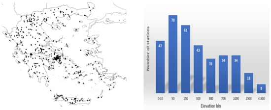 As a first step, gridded observations were created for the accumulated precipitation. Next, background observation information was added from satellite and radar estimated precipitation fields and the impact on the interpolated observation field for the specific weather situation was evaluated. Finally, the NWP forecasts were evaluated with two different spatial verification methods, each highlighting different qualitative characteristics of the numerical models in terms of precipitation predictability. For the specific application, surface observations were obtained from HNMS’ network of meteorological stations as well as the network of the National Observatory of Athens (NOA). Many of the stations are located at medium to high altitudes (~70 stations above 1000 m), which is critical for spatial representation of rain in areas with intense relief. The geographical distribution of the stations and the histogram of the range of their altitudes are given in Figure 2.