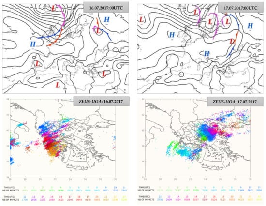 Surface map with frontal analysis (MetOffice) (above) and map of electrical discharges (below) from the ZEUS system (https://www.meteo.gr/talos (accessed on 10 May 2022) for 16 July 2017 00:00UTC (left) and 17 July 2017 00:00UTC (right) with the colors indicating the hour of the day with lightning activity.