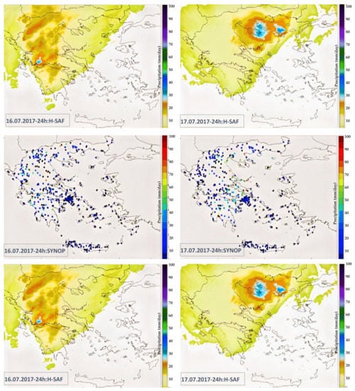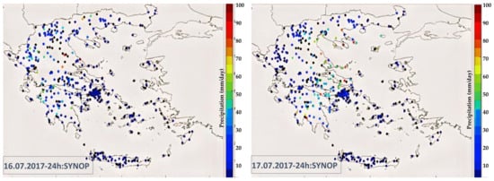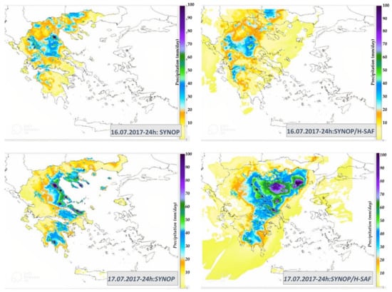 Surface observations were used to generate gridded observations for the cumulative 24-h precipitation. Significant amounts of precipitation fell on 16 July in the west and central mainland of Greece, while on 17 July even higher amounts (>70 mm/24 h) were recorded in the eastern as well as parts of the northern mainland (Figure 4). Rainfall estimates retrieved from H-SAF product H05 are also shown in Figure 4. The color scale indicates areas where differences exist between the surface observations and the H-SAF data, the latter being significantly lower. Previous research [] has identified the tendency of precipitation product H05 to underestimate the amount of rain in cases of severe weather. It should be noted however that the satellite product H05 allows precipitation estimates over the sea, providing a comparative advantage in spatial coverage, especially around Greece’s many islands.