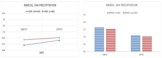 NME% (left, y axis) and NRMSE (right, y axis) with (red) and without (blue) the use of H-SAF background field after the application of LOOCV for 16–17 July 2017.