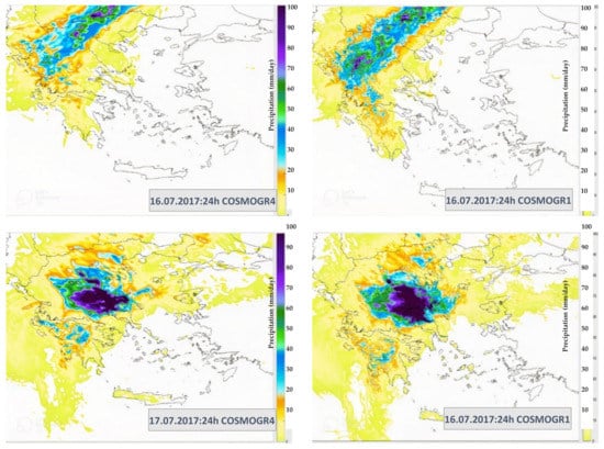 24-h precipitation forecasts for 16–17 July 2017 with COSMOGR4 (left) and COSMOGR1 (right). Precipitation color range: <10 mm/day—light yellow to 100 mm/day—dark purple.