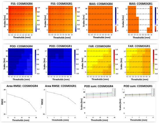 Two statistical indices (BIAS and POD) were calculated using the Upscaling spatial filter that applies the average value of rainfall to constantly expanding spatial windows. The BIAS (first row, column 3–4) for both models highlight an underestimation of rainfall amounts (BIAS < 1) for all thresholds and spatial scales for COSMOGR4 but slightly less so for COSMOGR1. The Probability of Detection (POD) (second row, column 1–2) values improve almost linearly for COSMOGR4 with increasing threshold and spatial scale, while the probability of a successful forecast of a rainfall threshold is very small, especially for larger amounts of rain, for COSMOGR1 at spatial scales at or below 9 km.