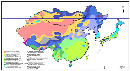 Location of Harbin in the Köppen–Geiger climate map of East Asia. Enhanced by the authors, derived from the Köppen–Geiger climate map in Wikipedia. The content of this website is licensed under CC BY-SA 3.0 (https://creativecommons.org/licenses/by-sa/3.0/, accessed on 28 February 2022).
