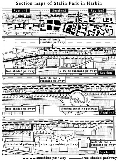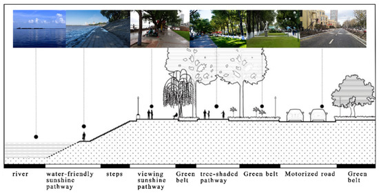 As Harbin is located in the middle reaches of the Songhua River, the seasonal variations in water level in this section are significant [43]. To prevent floods, the revetment of the waterfront park on both sides of the Songhua River is designed to be a double-layer stepped slope protection section structure (Figure 2). There are three main recreational pathways on the structure’s natural, two-level platform in Stalin Park. (The configurations of the sunshine and tree-shaded pathway in Stalin Park are shown in Figure 3). Steps connect the upper and lower levels of the park’s two-level platforms, and the flood banks extend into the water.