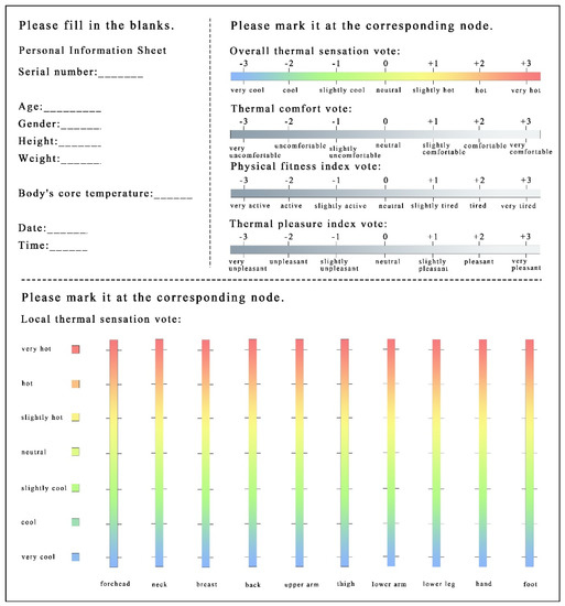 Questionnaire: The questionnaire survey mainly collected two forms of data. The first part recorded the experiment time and basic information of the subjects, such as gender, age, height, weight, etc. (Table 1 summarizes the subjects’ statistical information). The second part collected the immediate feedback of subjects during the experiment by setting voting items, including local and overall thermal sensation, thermal comfort, fatigue scale vote, and thermal pleasure. (The questionnaire is shown in Figure 4).