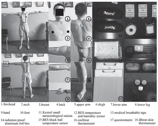 Real-time skin temperature test: Apart from conducting questionnaire surveys, we also used the Omron cochlear temperature testing gun to measure and record subjects’ core temperature and iButton to record the subjects’ local skin temperature. According to the study of Joon-Ho Choi and Vivian Loftness, the most appropriate thermal sensation model study required at least eight measurement points to collect skin temperature data [51]. Combining previous studies and the “eight-point measurement” recommended by EN ISO 9886:2004 standard ergonomics, physiological measures of thermal strain were evaluated [52]. Therefore, ten parts (as shown in Figure 5), including forehead, neck, back, breast, upper arm, lower arm, hand, thigh, lower leg, and foot, were selected as the loci of local skin temperature of the human body. The skin temperatures of these loci were automatically monitored and recorded by iButton, and the measurement and recording period was 1 min. Figure 5 shows the instrument and layout of human partial skin temperature and body core temperature measurement.